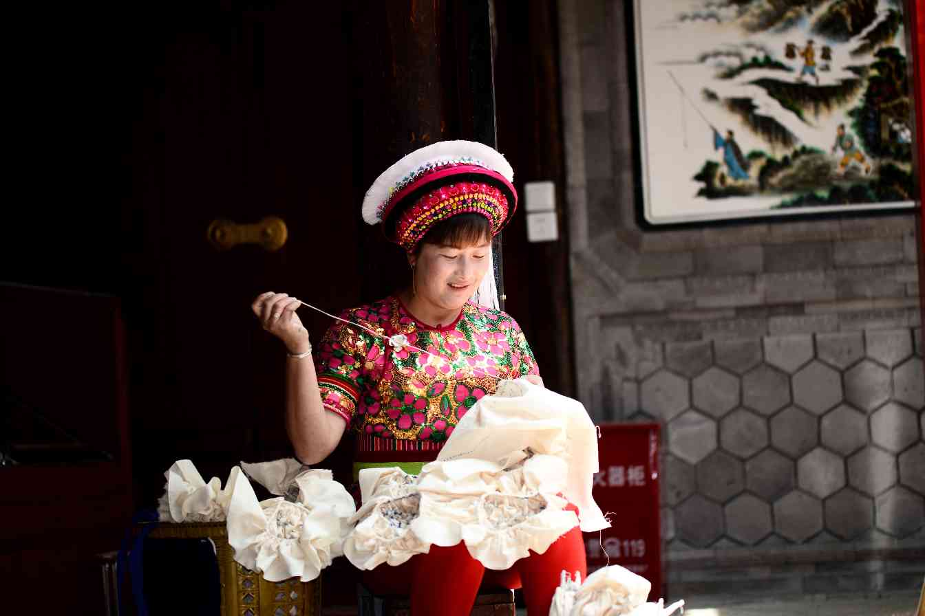 距离大理古城约20公里的喜洲镇周城村,汩汩的泉水顺着七拐八弯的巷道流淌,两侧白墙青瓦院落是白族的传统建筑。一阵风吹来,院子里晾晒的扎染布如蝴蝶翻飞,扎染的主要染料——板蓝根发酵出的独特清香萦绕不去。白族扎染技艺的国家级代表性传承人段银开指间缠绕着针线,素白棉布在针脚间蜷成细密的结。