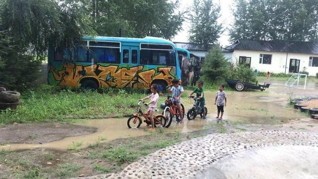 “快乐学校”里,孩子们骑车玩水不亦乐乎。