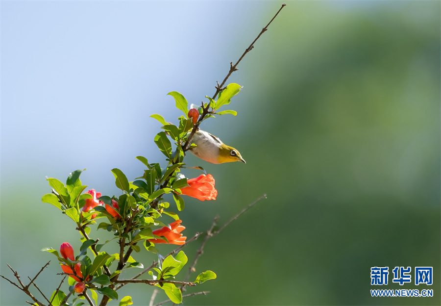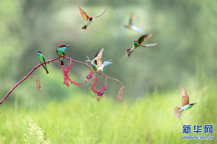 河南省信阳市新县位于南北气候过渡带,地跨长江、淮河两大流域,植被覆盖率达95%,森林覆盖率达76.7%。得天独厚的自然生态环境,吸引了蓝喉蜂虎、蓝翡翠、戴胜等众多鸟类在这里“安营扎寨”,绘出一幅生动和谐的自然画卷。新华网发(阚敦传 摄)