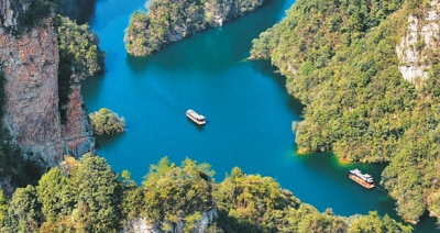 游客乘船在湖南张家界宝峰湖景区游玩。